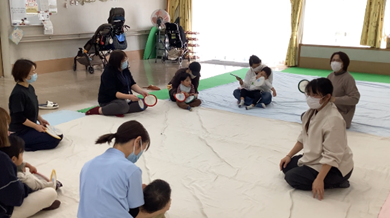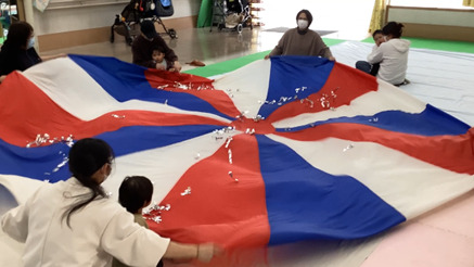 音楽に合わせてのオーガンジーやパラシュート遊びではみんなニコニコの笑顔