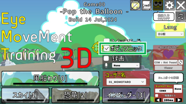 また、視線入力ソフトのEyeMoTには、「ボディソニック」というオプションボタンがあり、これにチェックを入れると風船を割ったりしたときに1秒ほど強めの振動が伝わります。