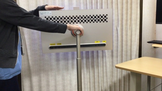一見テレビのようにも見えますが、その正体は32インチ・4K解像度の高画質な大画面タッチパネルと、高さ調節や移動が可能なアーム部分が一体になった大型のタブレット機器です。
