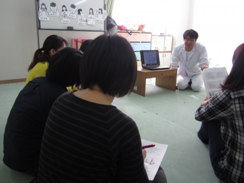 親御さんと離れても大丈夫なお子さんは後ろでスタッフが保育を行い、お母様方にお話しを聞いていただきました