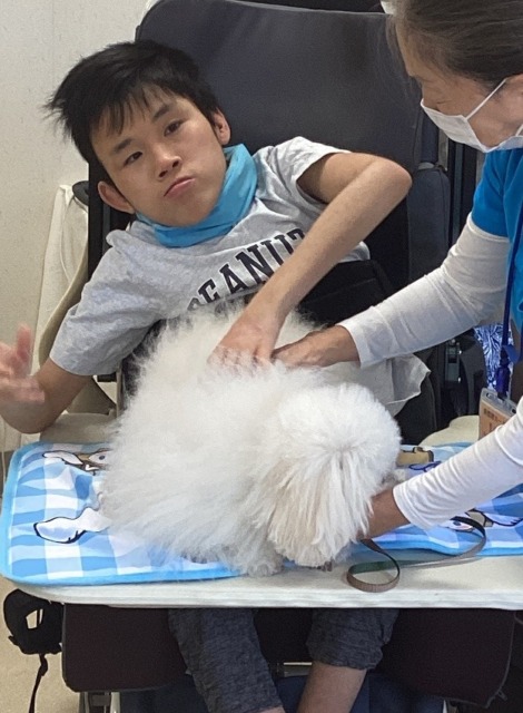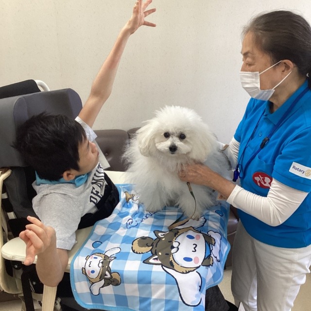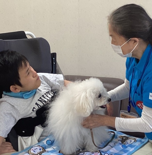 ハンドラー(飼い主)と重症児(者)・家族・職員がそれぞれお互いに関わりを持ち、重症児(者)にとってさまざまな人や広がりをつくりだすことを目的としています。
