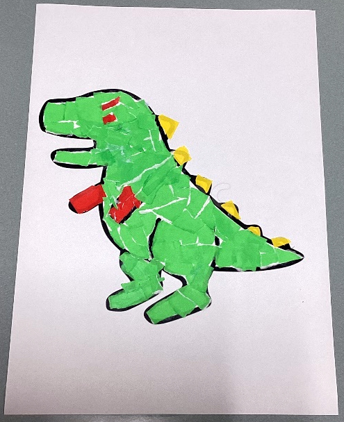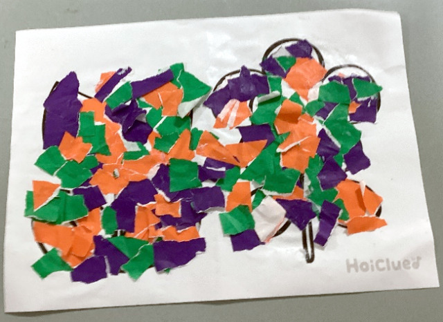 下絵が決まったら好きな色の折り紙をちぎり、次々と下絵に貼っていきます。