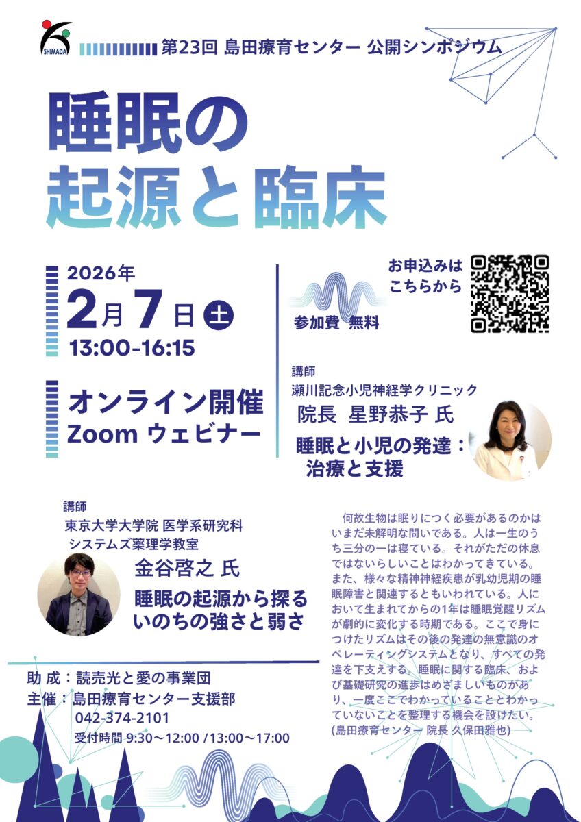 また、様々な精神神経疾患が乳幼児期の睡眠障害と関連するともいわれている。人において生まれてからの1年は睡眠覚醒リズムが劇的に変化する時期である。ここで身につけたリズムはその後の発達の無意識のオペレーティングシステムとなり、すべての発達を下支えする。睡眠に関する臨床、および基礎研究の進歩はめざましいものがあり、一度ここでわかっていることとわかっていないことを整理する機会を設けたい。